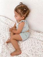 Featuring a beautiful crop with shoulder ties and a high waisted short with frill trims.